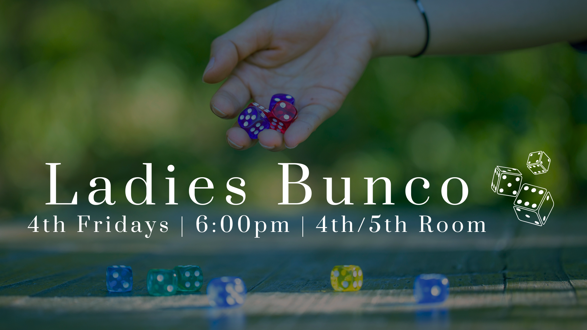 Ladies, come join us for Bunco and an evening of fun and laughter! Bring a potluck dish to share and your own drink (with a lid). We will provide coffee.