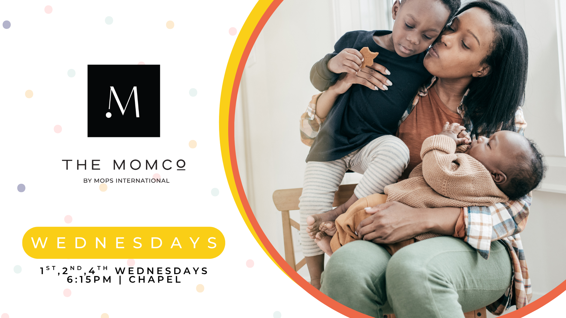 1st, 2nd, 4th & 5th Wednesdays 6:15pm-7:45pm | ChapelSep 3, 2025-May 27, 2026The MomCo mission is to create a community where moms can flourish and encounter Jesus. This Wednesday evening group is for all moms, especially working moms who aren’t able to attend the Friday MomCo group.